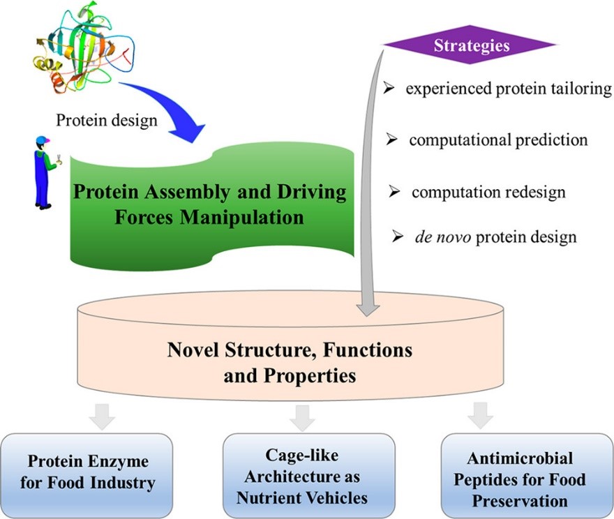 近日,人生就是博ag(中国区)·公司官网川渝共建特色食品重庆市重点实验室张宇昊教授和陈海副教授综述了基于理性设计的功能性蛋白结构研究进展及其在食品科学中的应用。本文介绍了蛋白质折叠和组装的基本原理以及蛋白质理性设计的原则和策略,同时重点讨论了蛋白质理性设计在食品科学领域中的最新研究进展,从酶的改造、笼状蛋白质制备和抗菌肽的优化等方面进行了综述,并提出了基于蛋白质理性设计策略制备性能优良的蛋白质生物分子所面临的挑战以及未来的发展趋势。