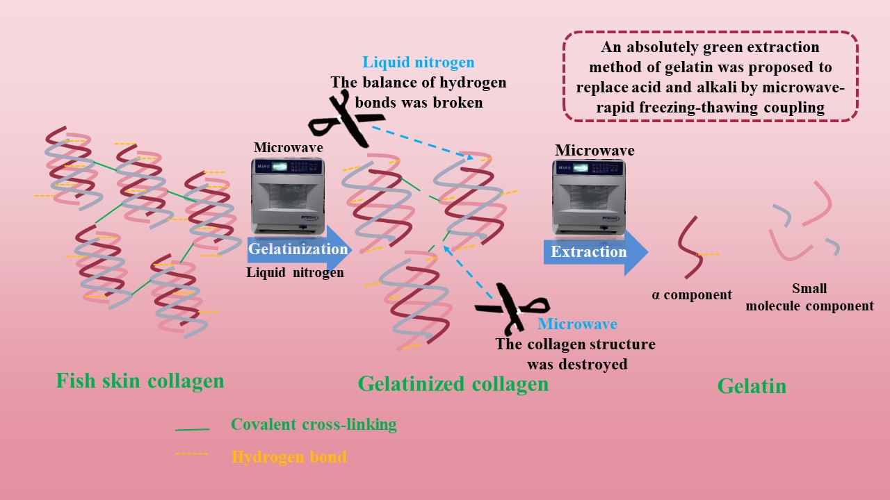 该法主要通过微波预处理破坏鱼皮胶原的三螺旋结构和共价交联,冻融预处理会破坏胶原分子中氢键的平衡,使紧密的胶原纤维结构松散,最终通过热力浸提获得明胶成品,产品完全符合GB 6783要求,可替代传统工艺制备明胶,解决目前鱼皮明胶产业高污染的瓶颈问题。