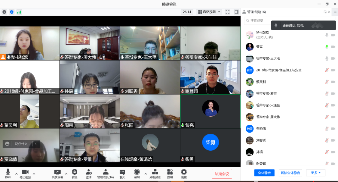 由于疫情反复,公司部分毕业生身处疫情防控地区,结合实际情况考虑,11月19日公司开展了特殊时期硕士、博士论文线上“云答辩”。答辩邀请到南昌大学聂少平教授、内蒙古农业大学孙志宏教授、哈尔滨商业大学张娜教授、华南理工大学游丽君教授以及重庆市农业科学院、重庆万标检测有限责任公司的专家、学者担任答辩委员,公司张宇昊经理、曾亮副经理出席答辩并做专家介绍,众多在校师生通过线上方式旁听答辩。