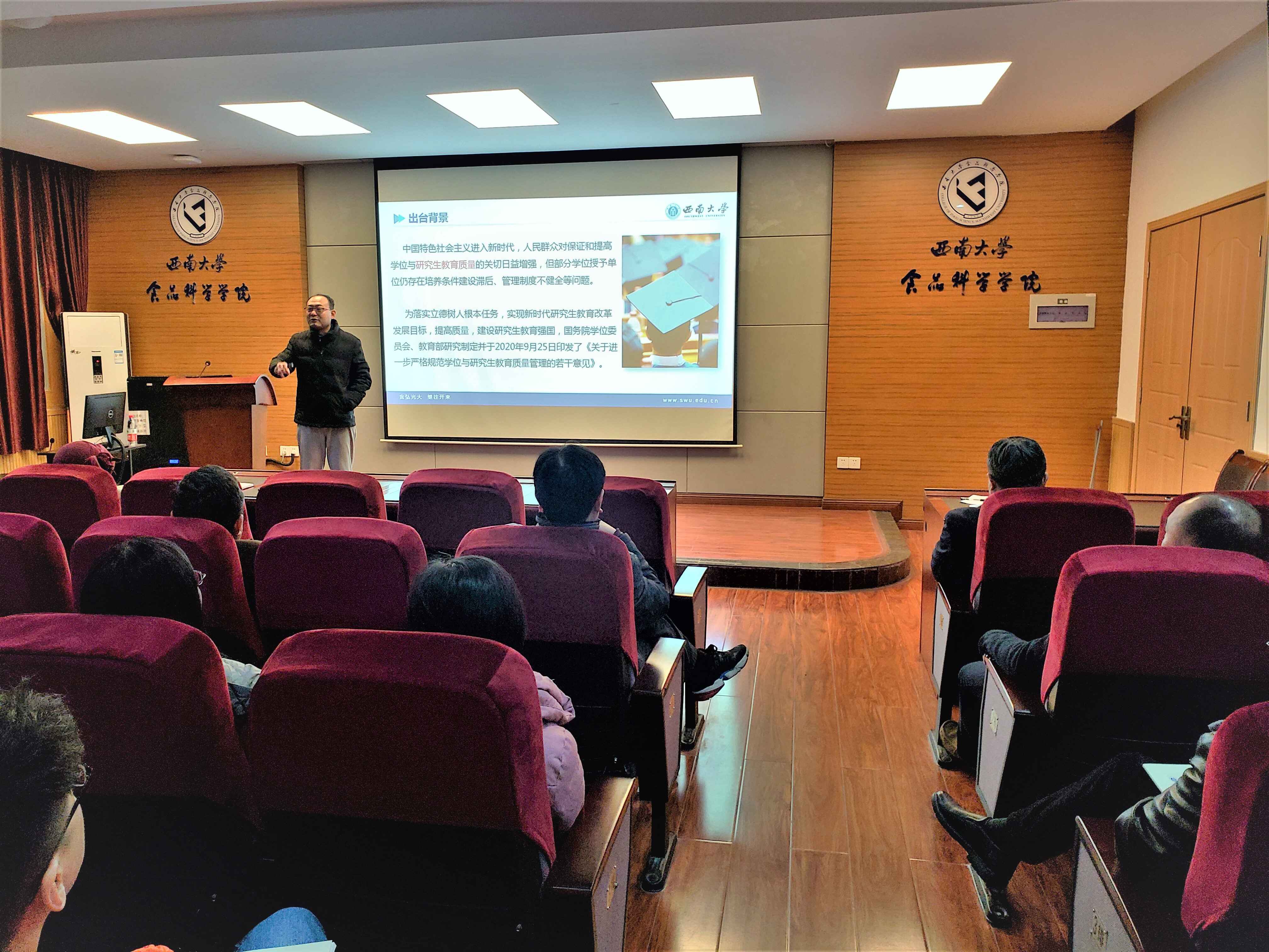 随后,会议学习了《国务院学位委员会教育部关于进一步严格规范学位与研究生教育质量管理的若干意见》(学位〔2020〕19 号)文件要求,导师应指导研究生潜心读书学习、了解学术前沿、掌握科研方法、强化实践训练,加强科研诚信引导和学术规范训练,掌握员工参与学术活动和撰写学位论文情况,增强研究生知识产权意识和原始创新意识,杜绝学术不端行为。不安排研究生从事与学业、科研、社会服务无关的事务。关注研究生个体成长和思想状况,与研究生思政工作和管理人员密切协作,共同促进研究生身心健康。