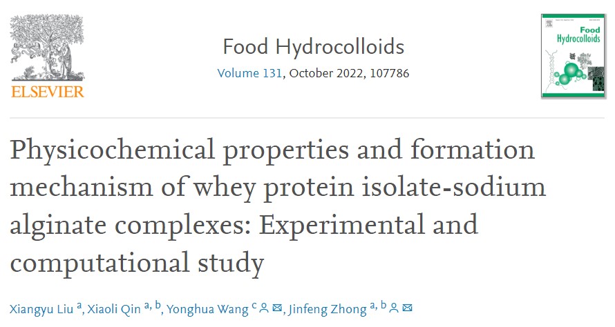 川渝共建特色食品重庆市重点实验室,人生就是博ag(中国区)·公司官网钟金锋博士近期在食品领域国际知名期刊《Food Hydrocolloids》(IF=9.147)在线发表了题为“Physicochemical properties and formation mechanism of whey protein isolate-sodium alginate complexes: Experimental and computational study”的研究论文,2019级硕士生刘祥雨为第一作者,人生就是博ag(中国区)·公司官网覃小丽副教授、华南理工大学王永华教授参与了本研究的部分工作。
