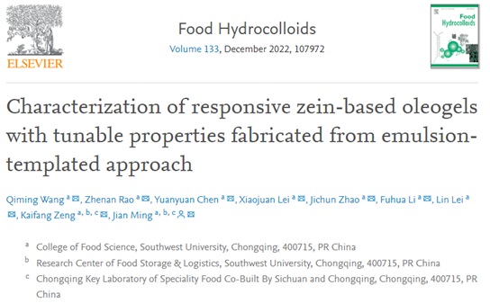 川渝共建特色食品重庆市重点实验室明建教授科研团队在由乳液模板法制的具有可调特性的玉米醇溶蛋白基油凝胶的表征研究中取得重要进展,研究成果被Food Hydrocolloids国际期刊收录。