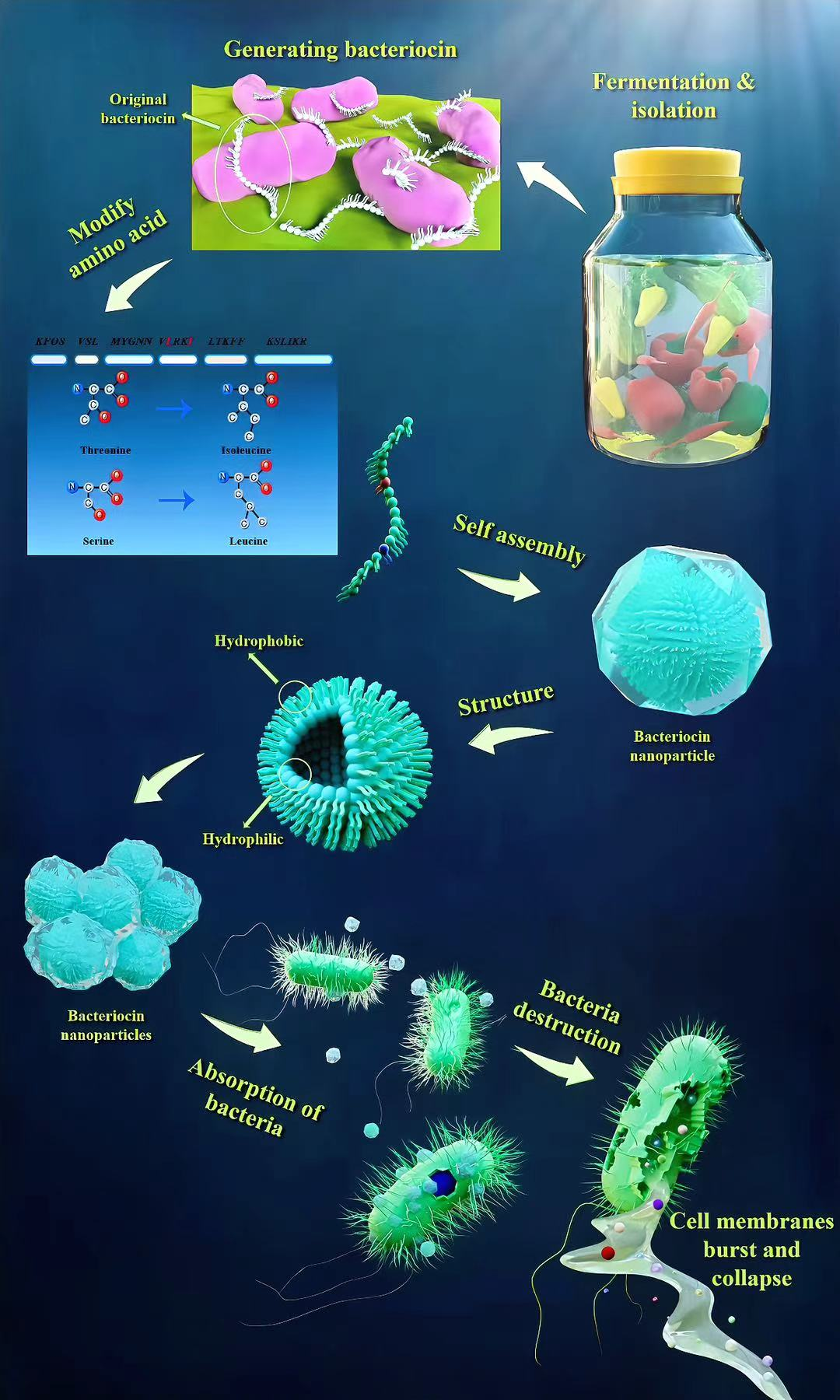 本研究从中国传统发酵食品泡菜中分离得到一个植物乳杆菌来源的新型细菌素,并通过疏水性改造,使其无需外加刺激或载体,即可在培养基甚至NaCl溶液中自发组装为纳米颗粒。该纳米细菌素同时对革兰氏阳性和阴性菌表现出高效抗菌活性,展示了乳酸菌来源纳米抗菌剂在安全、可持续抗菌应用中的巨大潜力。本研究不仅突破了传统抗菌肽稳定性和抗菌谱受限的瓶颈,也为未来在食品防腐、耐药菌控制及替代抗生素方面的应用提供了重要思路与理论基础。