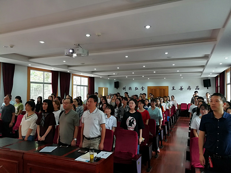 当《义勇军进行曲》奏响,师生集体起立齐唱国歌,向在天安门广场冉冉升起的五星红旗行注目礼。师生们认真聆听习近平总书记在庆祝中华人民共和国成立70周年大会上的讲话、聚精会神观看国庆阅兵分列式和群众游行。
