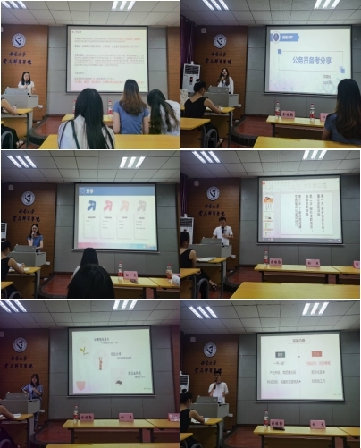 2018级食品科学专业的刘缘勤,以考取事业单位为中心做了交流。她建议研究生同学们要从当下开始,从性格和习惯方面了解自己,找准定位。在工作内容上,刘勤缘详细介绍了高校岗位的设置与各自的职能,随后介绍了对应的招聘要求以及应聘技巧。