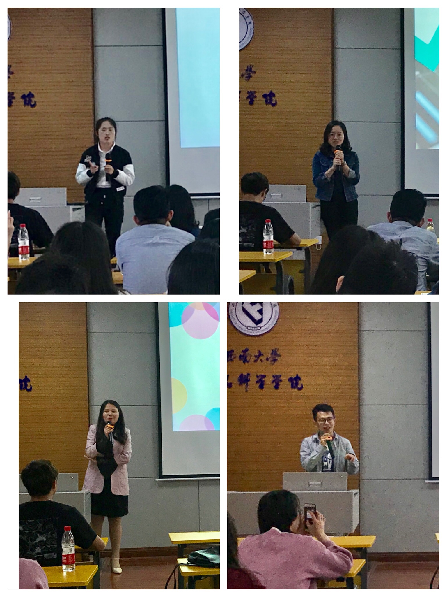 来自工程技术学院的郑延莉、曾任公司研究生会主席的李晓艺以及副主席唐欢欢对求职过程中简历的撰写和面试技巧做了分享。此外,郑延莉对招聘信息的多种来源进行了分享,李晓艺指出职业测评对职位匹配非常重要,唐欢欢通过讲述求职过程中的心路历程,指出求职过程应当要有所选择。最后,求职能手张国星对于求职前和求职中的准备、求职信息来源途径以及笔试面试技巧作了详细地阐述,尤其是提供了针对于食品专业方向就业的宝贵经验,大家受益匪浅。