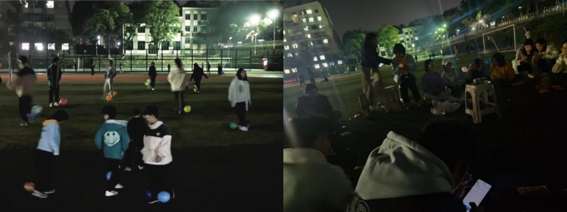 在踩气球游戏中,每位同学脚腕处绑有两个气球,如果气球均被踩破则遗憾下场,在层层淘汰后,现场氛围紧张,场下同学纷纷呐喊助威,最后竟难分胜负。在抢椅子环节,同学们紧绷神经,仔细分辨“坐”的声音,展开一轮又一轮激烈的竞争。向左向右看的游戏则考验了大家的反应速度和应变能力。到最后听歌识曲的游戏时,同学们纷纷集中注意力,努力分辨每一首歌曲。有同学跟着旋律合唱,歌声回响在四运上空,也响在每位同学的心里。