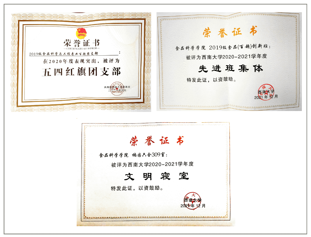 “百超”创新实验班的员工大胆探索,以竞赛为平台,开展了大量的科学研究,参加了各类创新创业大赛,取得了不错的成果。截至目前,班级员工共计获奖40余项。其中包括CIFST-2021年度宏胜饮料KellyOne杯创意饮品大赛二等奖1项;“互联网+”创新创业大赛重庆市级金奖、银奖、校级金奖等奖项10项;“欧倍尔杯”第四届全国食品专业工程实践训练综合能力竞赛团体特等奖1项;全国老员工数学建模竞赛国家级一等奖1项,省部级二等奖1项;校级数学建模竞赛二等奖3项;全国老员工数学竞赛省部级一、二、三等奖共5项,员工的创新能力、动手能力和写作能力得到了极大提升。