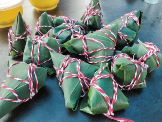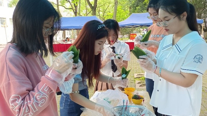 上午九点整,活动正式开始,由志愿者现场包好的端午夏粽吸引了诸多学子的关注。志愿者为参与的同学们介绍了端午节在中国传统佳节中的由来及意义,并指导同学们现场制作粽子。在包粽子的过程中,参与者以饱满的热情进入“沉浸式“包粽子的状态。一双双巧手飞舞,一张张绿莹莹的粽叶变换成漏斗状,糯米等食材被填进粽叶“肚”,一缠一系。粽子的形状各不相同,有的尖三角状,有的四角状,有的方形,这不仅提高了动手能力,也激发了同学们的创造性。