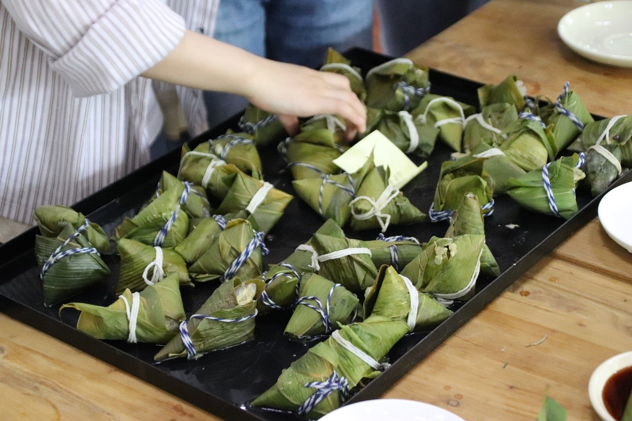 活动以端午诗朗诵的形式拉开帷幕,在诗中,品人生百态,览“粽”情湖山。紧接着,进入特色风味粽子的讲解和展示环节,师生一边品尝粽子和酒一边聆听讲解。在包粽子体验环节,在场的老师和员工们都踊跃的参与其中,在劳动中感受端午的习俗和劳动的趣味。