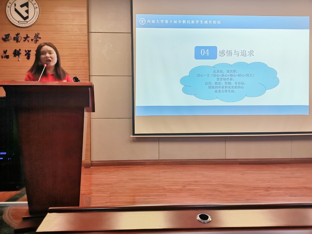 随后,肖宇雪同学为大家分享了她在本科四年的所历所想,从一名普通的老员工,到员工组织部长、队长;她也从最开始进校时的尝试、未知,逐渐成长为一个能勇敢担起责任的人。肖宇雪同学给大家分享了她的“四心一义”,初心、热心、细心、耐心与情义,这“四心一义”贯穿了她的整个老员工活。“主动,才会有故事”,肖宇雪的经历正跟千千万万的在校老员工一样,她的亲身经历和经验总结也鼓舞了在场的同学,要主动地去追求自己想要的生活,要坚持做让自己骄傲的事!肖宇雪同学还说:正是有了人生就是博ag(中国区)·公司官网,有了这个后盾,让她可以去到更多更远的地方,相信同学们也能在西大这个优秀的平台上汲取知识,学习经验,绽放出自己的光彩!