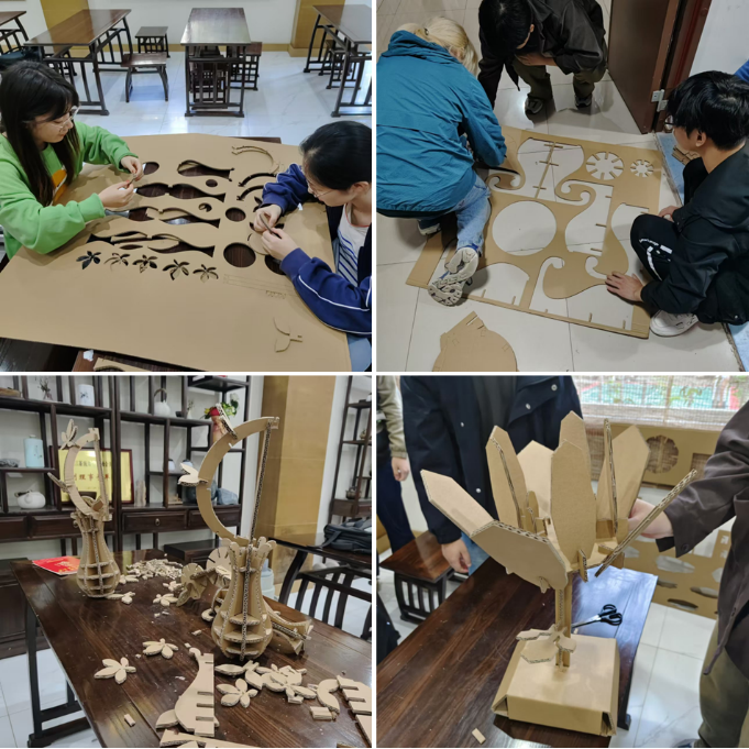 在活动过程中,任丹老师特别强调了模切机的安全使用。在老师的指导下,同学们学习了模切机的操作方法,并在实践中严格遵守安全规程,确保了活动的顺利进行。经过几小时的紧张工作,造型独特、结构巧妙的八角章鱼凳和花瓶呈现在大家面前。
