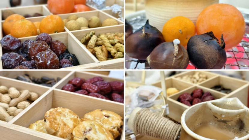 活动开始前,同学们精心布置了场地,准备了气球、小红灯笼,以及橘子、桂圆、柿子、花生和瓜子等各种水果茶点,寓意着红红火火,“好柿花生”!同学们以围炉为中心,将茶具和食物摆放整齐,营造了温馨的节日氛围。