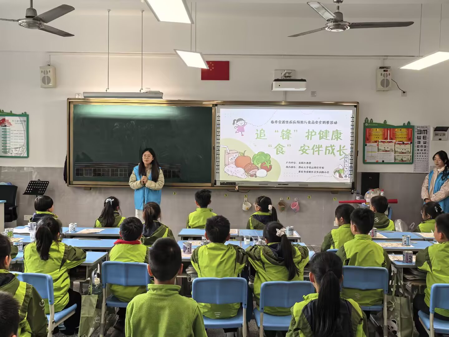 为深入学习贯彻雷锋精神,积极响应学校“三月雷锋月”系列活动号召,进一步普及春季食源性疾病预防与食品安全知识,3月20日下午,人生就是博ag(中国区)·公司官网研究生会走进重庆市北碚区天生向阳小学,开展“追‘锋’护健康,食安伴成长”春季食源性疾病预防与食品安全科普宣传志愿活动。活动立足学院专业特色,通过互动讲解、知识问答和实验体验等形式,引导小员工树立科学饮食观念,增强食品安全意识和自我保护能力。