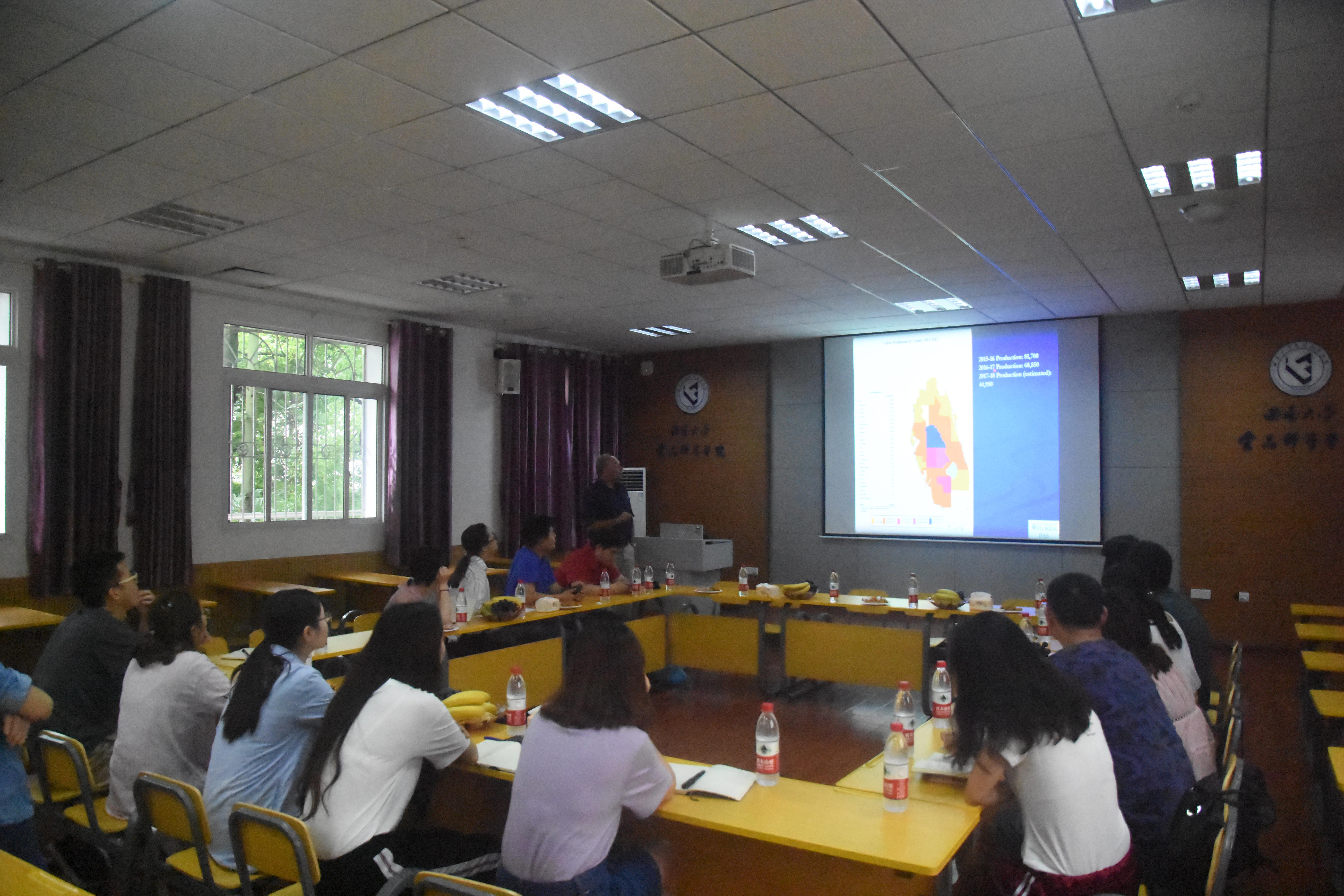 会议开始,Mark Ritenour教授以美国佛罗里达的柑橘商品化生产流程为切入点展开会议内容。他分享了美国佛罗里达的整个柑橘商品化生产流程,并生动形象地讲解了各个环节的操作方法以及目的。随后,Mark Ritenour教授以他所在实验室的研究成果为基础,为在座师生讲解了精油和打蜡在柑橘采后病害控制方面的应用和作用。并对柑橘黄龙病(HLB)进行了简要的介绍。最后,Mark Ritenour教授与在座师生共同探讨了关于柑橘采后病害以及柑橘采后商业化处理方面的问题。会议结束后,Mark Ritenour教授和在座师生合影留念。