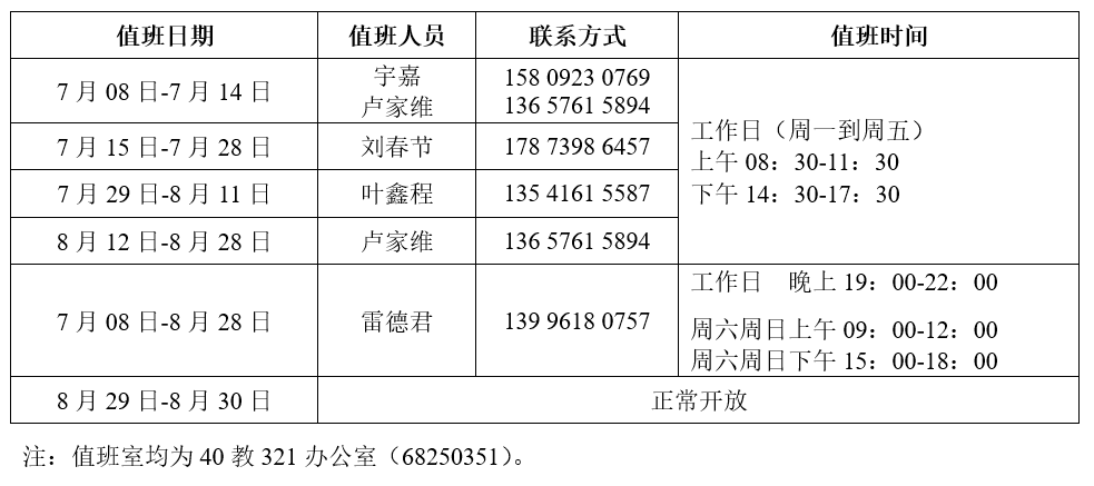 为保障暑假期间师生有序开展实验活动,人生就是博ag(中国区)·公司官网仪器设备共享服务平台及教学实验室正常开放。值班安排如下: